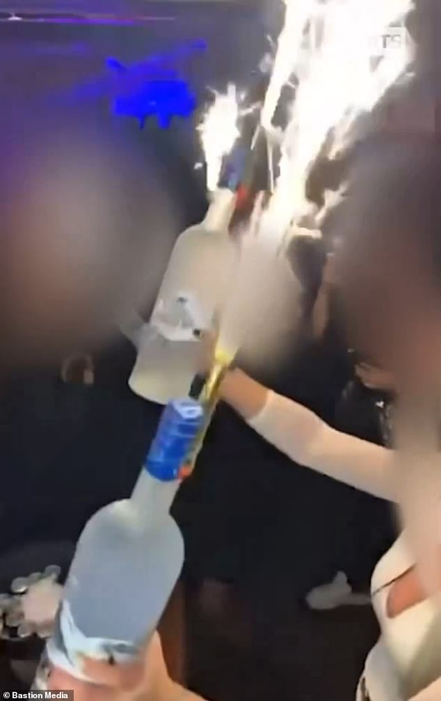 ‘Watch out for the foam, watch out for the foam,’ the waiter can he heard shouting in the video, as a sparkler in a bottle approaches the ceiling dangerously.