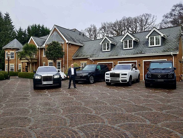 ‘Fred’ Doe Senior with a collection of luxury cars, including a Rolls-Royce, outside his house