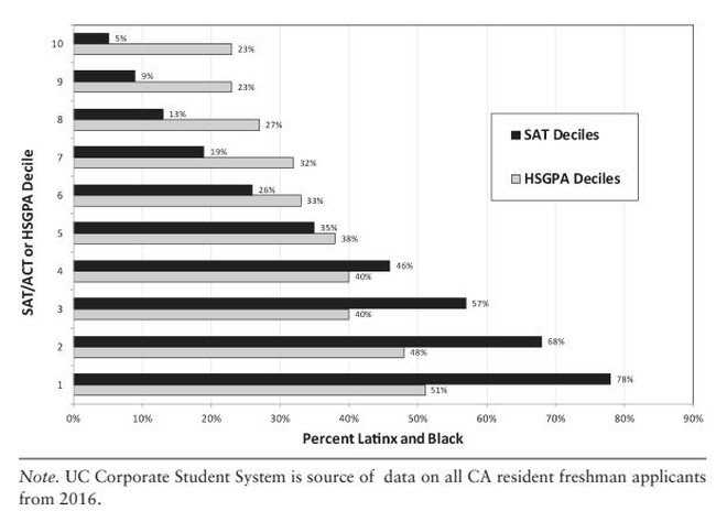It certainly shows that “Latinx and Black” students are a higher percentage of the top 10% when it comes to grades than when it comes to SAT scores. And from this his takeaway is that if we do away with SATs and only look at grades, universities can bring in a lot more minority students.