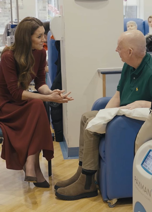Kate is seen talking to cancer patients in hospital in a moving video to mark World Cancer Day