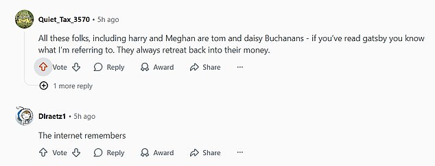 They wrote: ‘All these folks, including harry and Meghan are tom and daisy Buchanans – if you’ve read gatsby you know what I’m referring to. They always retreat back into their money.’