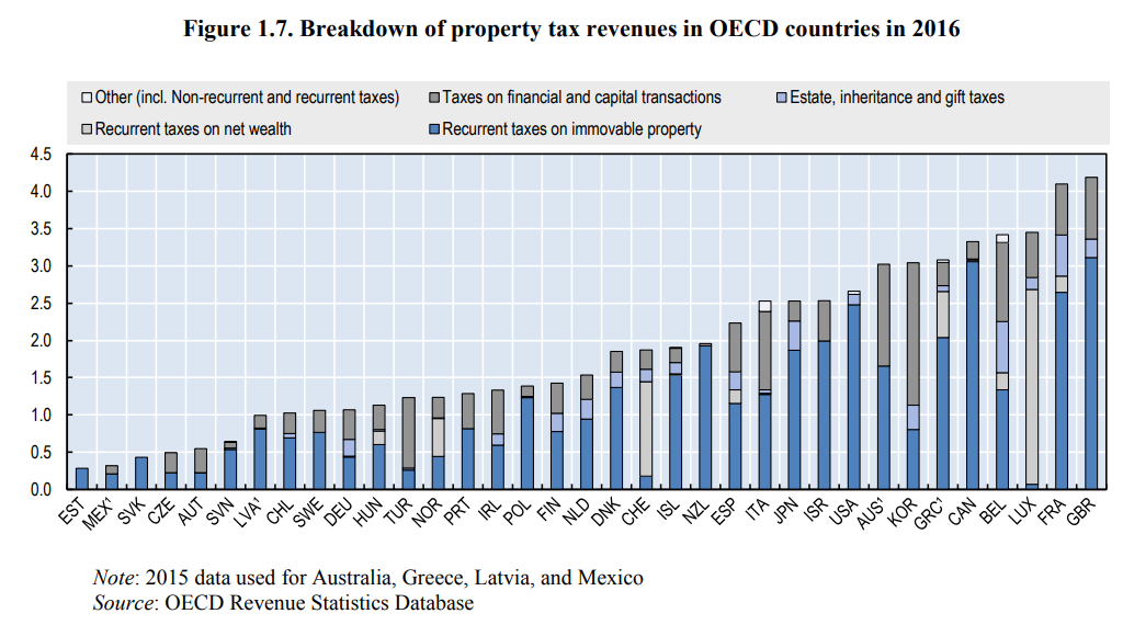 The nature and structure of existing taxes are not without controversy: CGT is argued to be too low and distortionary with rates out-of-kilter with higher income tax bands; stamp duty impedes transactions and thus an efficient market reallocation of homes; and council tax is based on values set in April 1991, which today do not reflect the subsequent, substantial shift in relative prices between geographical regions and housing categories. Despite this taxation mish mash and calls for more, the UK already raises more revenue via taxes on property than most OECD countries (see Chart).