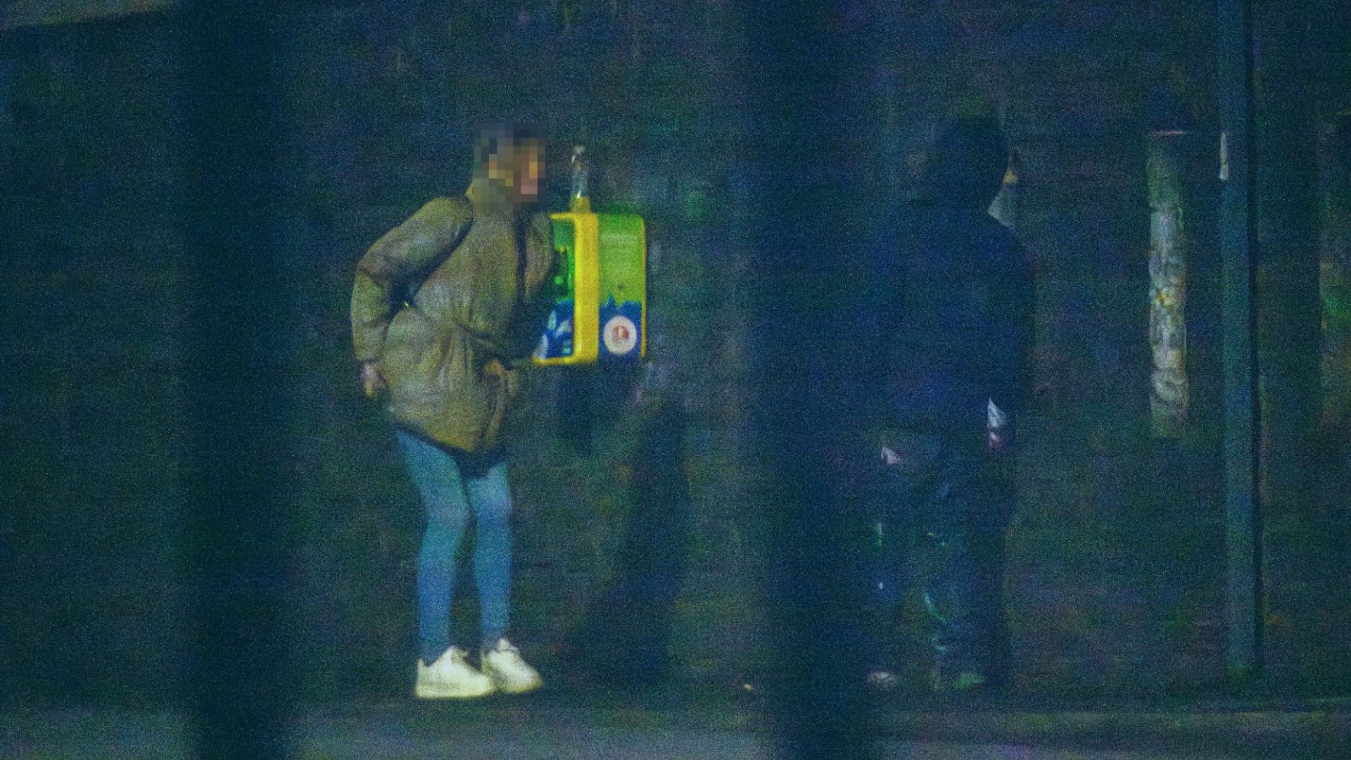 Alone in the dark, a hooded man walks up to her, gets close to her face and speaks, she nods and passes him something, before he quickly walks back down the street.