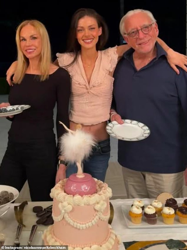 Nicola Peltz-Beckham is leaning into a ‘childlike identity’, a psychotherapist has claimed (Nicola is pictured at her ballerina-themed 31st birthday with her parents)