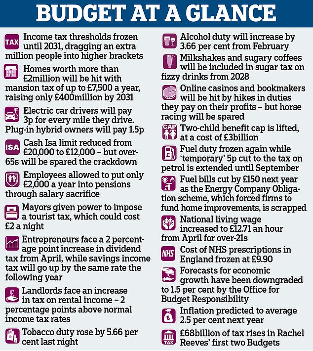 •  Ms Reeves bowed to Left-wing demands for a mansion tax of up to £7,500 a year despite Treasury warnings it will cost the taxpayer £300million in lost revenue in the coming years;