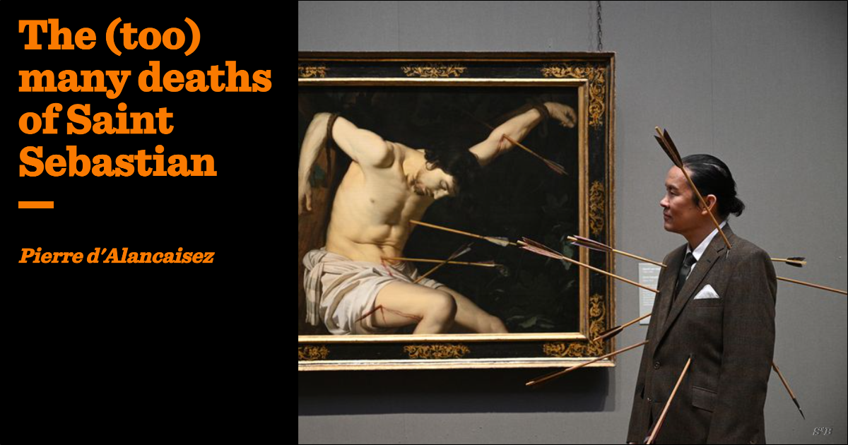 The identitarian curatorial agenda that led to this work’s commissioning aside — the National Gallery has a record of faddishly reinterpreting its collection — what are the rules for the aesthetic recasting of legends? It is no progressive gotcha that Sebastian himself is largely a projection, with only a skeletal account of his life being recorded a hundred years after his death. The idea of his double martyrdom stems from the fifth century. Voragine’s Golden Legend linked the arrows that nearly killed Sebastian with protection from the plague as late as the thirteenth.
