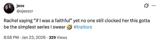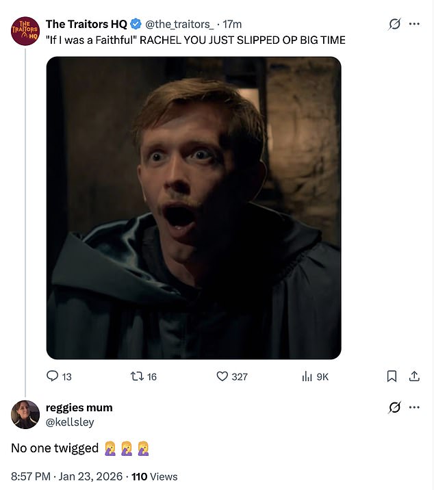 However, following his elimination, the group reconvened for further discussion, and eagle-eyed fans noticed Rachel accidentally revealed she was a Traitor.
