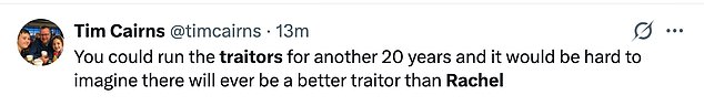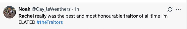 Flocking to social media, fans wrote: ‘Rachel really is the best and most honourable Traitor of all time. I’m ELATED’,