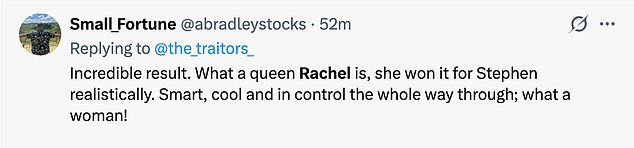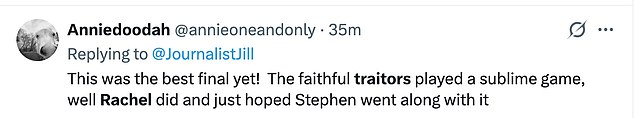 ‘This was the best final yet! The faithful traitors played a sublime game, well Rachel did and just hoped Stephen went along with it’,