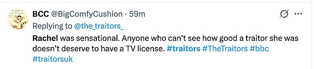 ‘Rachel is without doubt up there as one of the finest traitors we’ve seen. SO well deserved’,