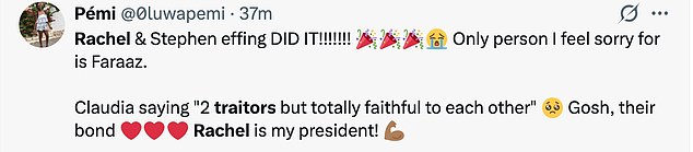 ‘Rachel & Stephen effing DID IT!!!!!!! Only person I feel sorry for is Faraaz. Claudia saying “2 traitors but totally faithful to each other” Gosh, their bond. Rachel is my president!’