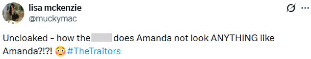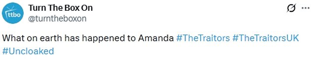 ‘What on earth has happened to Amanda #TheTraitors #TheTraitorsUK #Uncloaked,’;