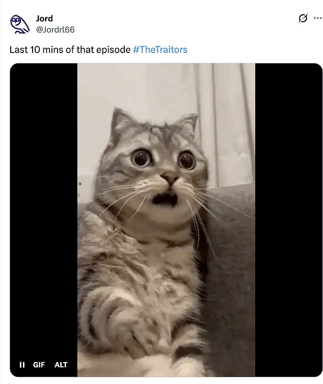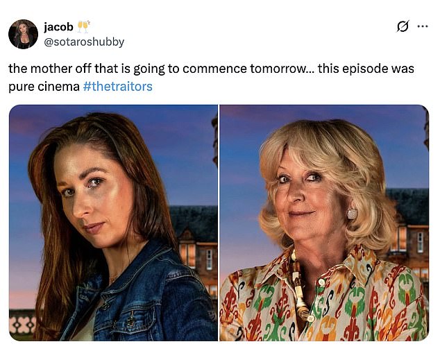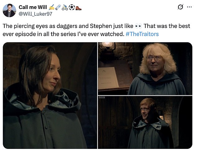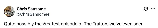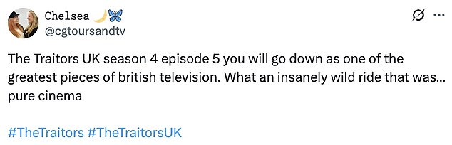 They wrote: ‘The Traitors UK season 4 episode 5 you will go down as one of the greatest pieces of british television. What an insanely wild ride that was… pure cinema’.
