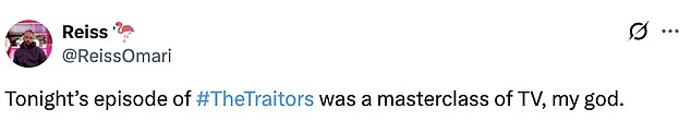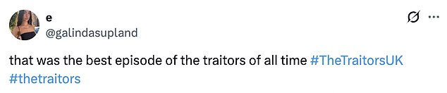 ‘Tonight’s episode of #TheTraitors was a masterclass of TV, my god’; ‘Quite possibly the greatest episode of The Traitors we’ve even seen’.