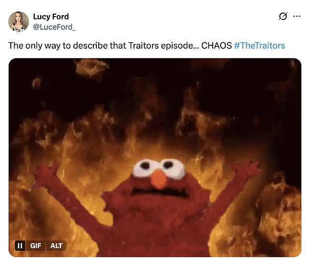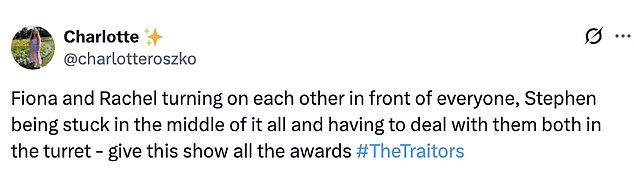 ‘The only way to describe that Traitors episode… CHAOS’; ‘Fiona & Rachel publicly going for each other in front of the whole cast is the messiest moment of Traitors history since the season 1 breakfast’.