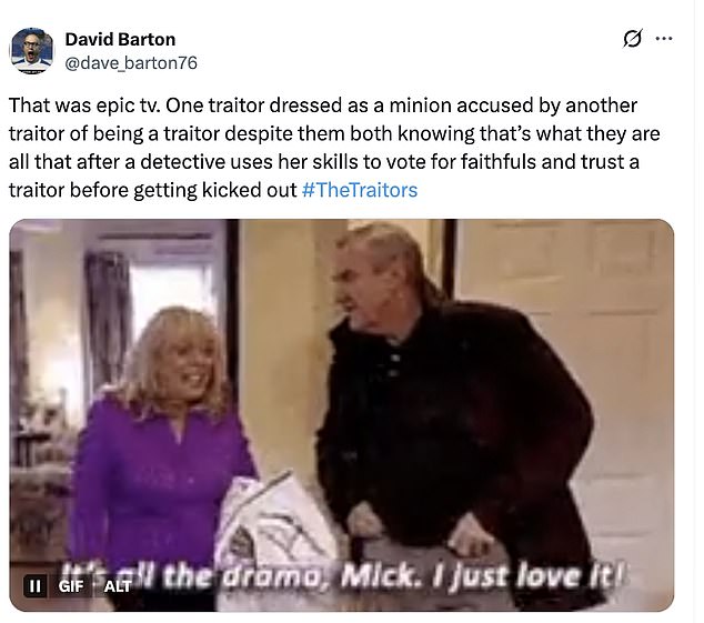 ‘That was epic tv. One traitor dressed as a minion accused by another traitor of being a traitor despite them both knowing that’s what they are all that after a detective uses her skills to vote for faithfuls and trust a traitor before getting kicked out’.