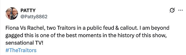 ‘Fiona Vs Rachel, two Traitors in a public feud & callout. I am beyond gagged this is one of the best moments in the history of this show, sensational TV!’
