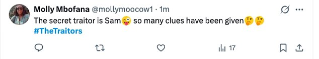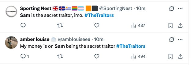 Viewers penned on X: ‘The secret traitor is Sam. so many clues have been given #TheTraitors’