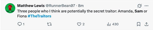 ‘Three people who I think are potentially the secret traitor: Amanda, Sam or Fiona #TheTraitors.’,