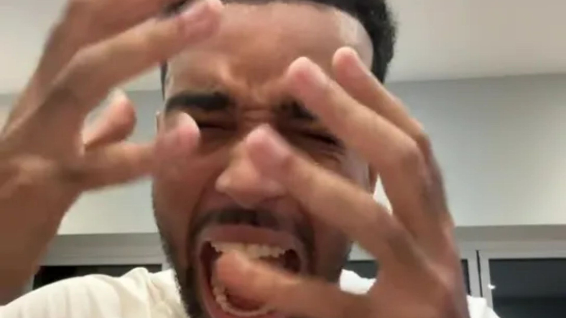He then proceeds to let out a squealing scream as he shakes his hand before going back into serious mode.
