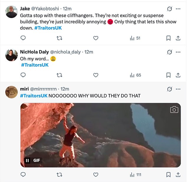 Viewers penned on X: ‘Jesus Christ that cliffhanger #thetraitors #traitorsuk’, ‘Traitors producers leave us with yet another cliffhanger. It’s had more than Eastenders’