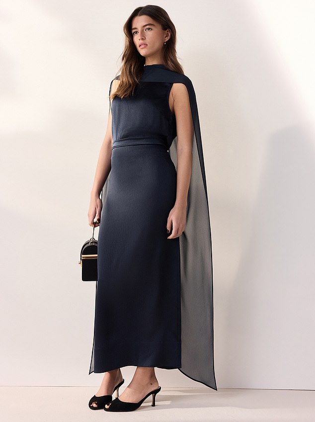 Hobbs have continued their black tie collection this season and this navy satin dress is the epitome of class. A floor-sweeping maxi so you won’t have to worry about baring your ankles, it features flattering bust ruching and a panel to define your waist. For £100 you can pick up this Tabitha Simmons for Next scarf detail column dress, which will also ensure you make a stunning entrance.