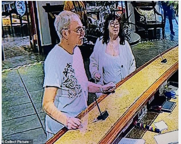 British tourist Lorna McSorley, 71, (right) pictured with her partner Leon Probert (left) at the reception desk of the Ghost Mountain Inn where the couple were staying