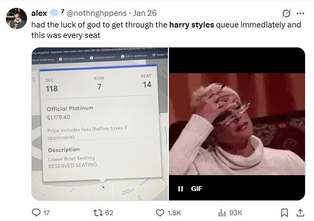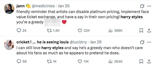 Posts on X included: ‘This is the WORST presale experience I’ve ever had. I really thought I had a chance to see Harry since I was 20k in line but they sold out in 30 minutes.