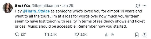 ‘Hey @Harry_Styles as someone who’s loved you for almost 14 years and went to all the tours, I’m at a loss for words over how much you/ur team seem to have lost touch with reality in terms of residency shows and ticket price. Music should be accessible. Remember how you started;’