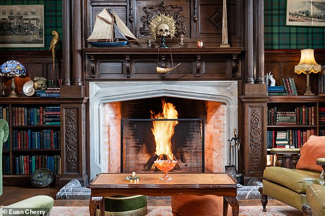 The dark, leafy wallpaper in the library, by a celebrated Swedish brand, adds to the eerie atmosphere.