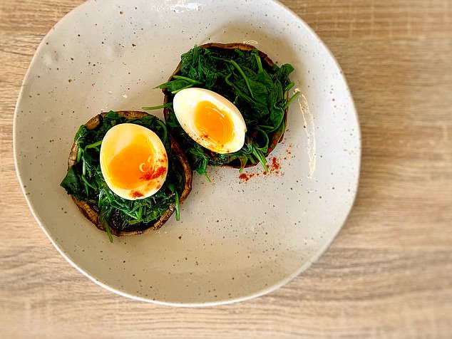 5. Divide the spinach and egg between the two mushrooms.