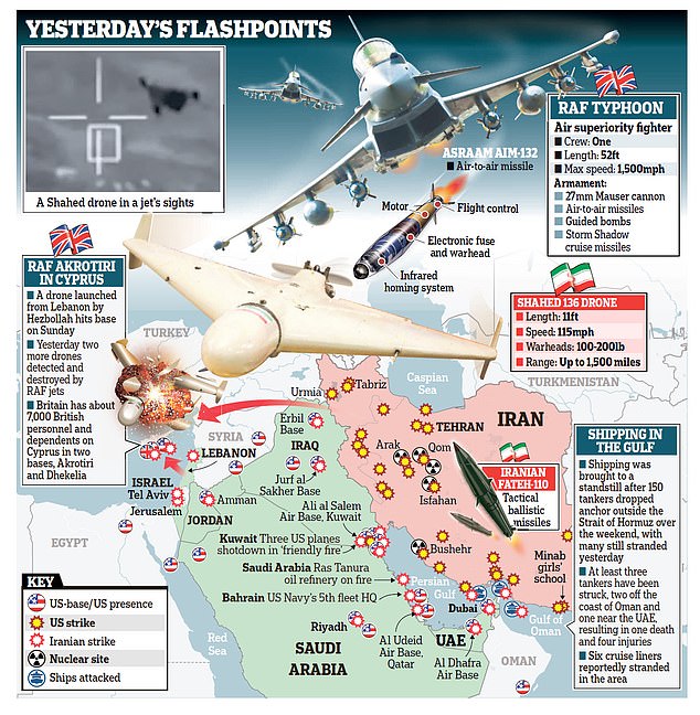 Sir Keir made a partial U-turn on Sunday after Iran lashed out at civilian targets in Gulf states and RAF Akrotiri in Cyprus, saying US jets would be able to fly from British bases for the ‘limited’ objective of destroying Iranian missile launchers and stockpiles.