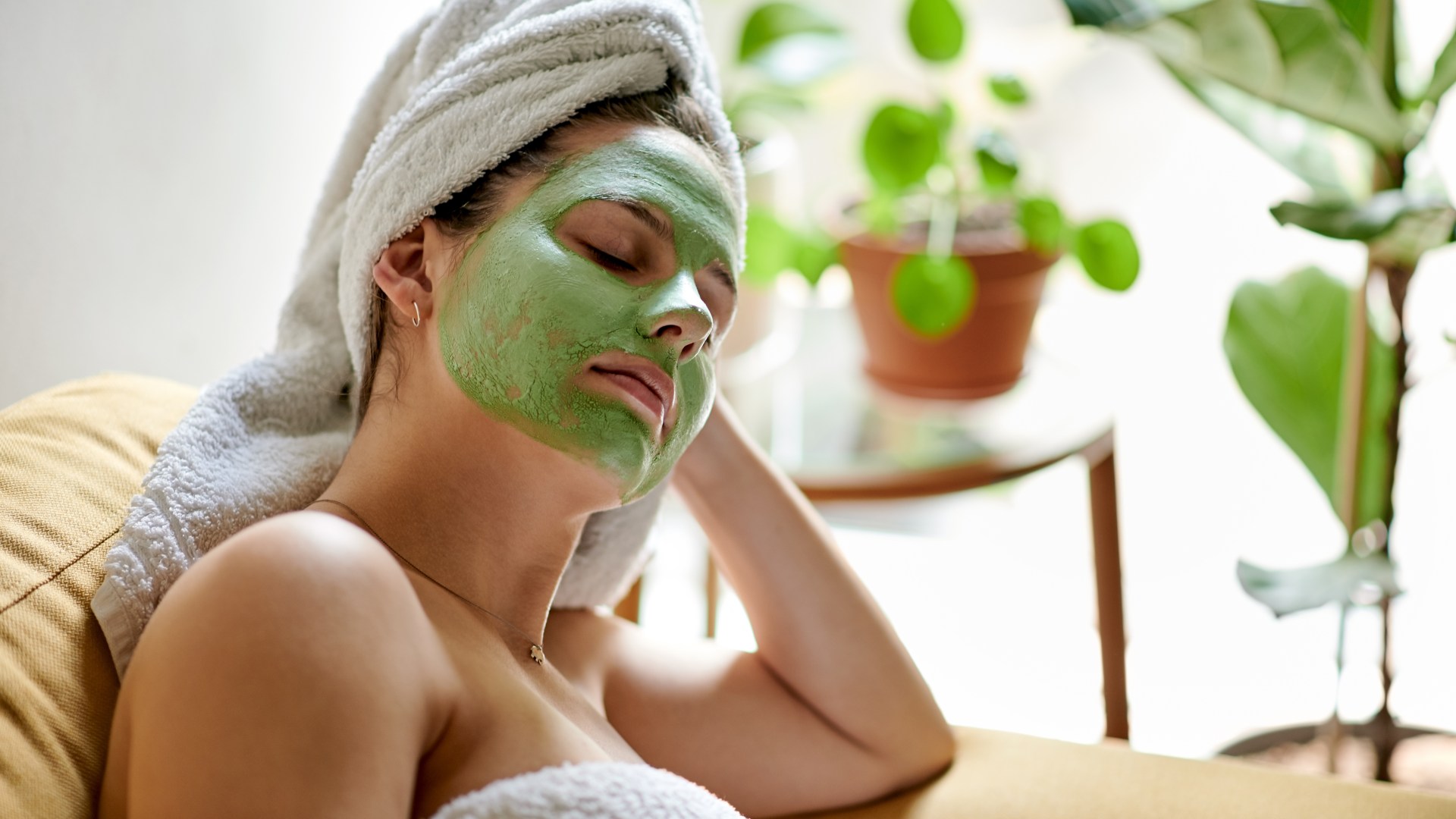 Woman with a green face mask and a white towel on her head, relaxing with her eyes closed.