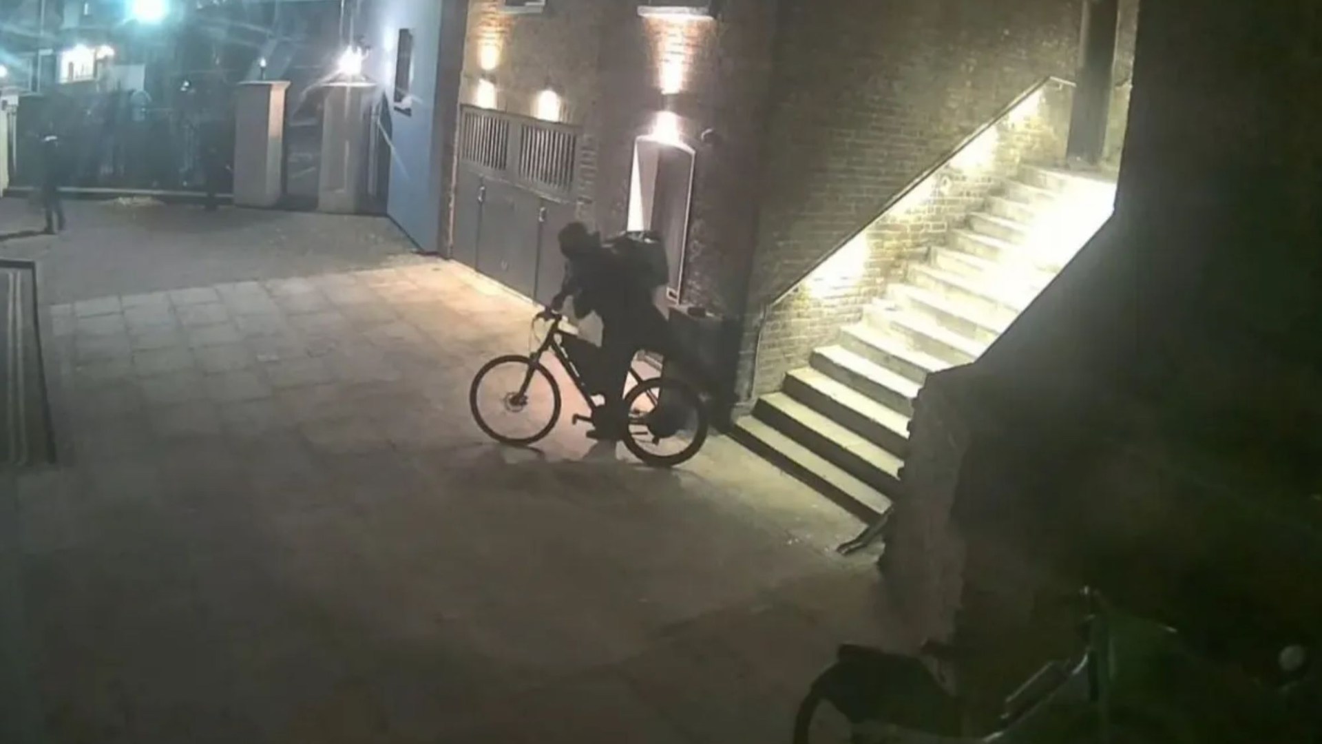 An image collage containing 3 images, Image 1 shows CCTV footage shows a man on a bicycle, wearing a dark jacket and a large delivery bag, in an alleyway at night, Image 2 shows A man with dark skin, short dark hair, and a mustache, wearing a gray sweatshirt, Image 3 shows Police officer and forensic investigator at the scene of a double shooting in Ladbroke Grove, London
