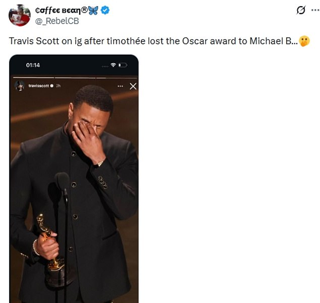 After Travis shared the snap, fans soon took to social media to insist that rather that being a congratulatory post for the Black Panther star, it was instead intended to mock Timothée’s snub.