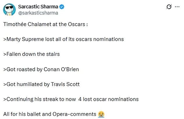 Yet, the ultimate humiliation came near the end of the night, when Timothee missed out on the Best Actor award.
