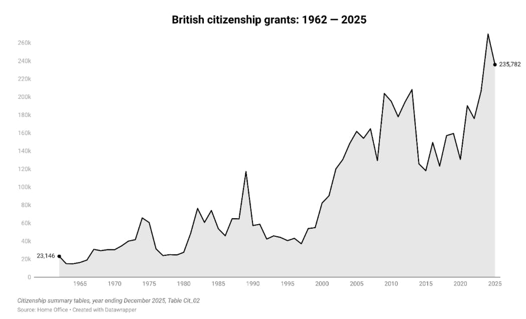 British citizenship grants are down from their peak in 2024, where 269,806 British citizenship grants were issued, the highest since records began. Britain has issued more citizenship grants in the last three years (2023-2025) than Japan has issued since 1967.