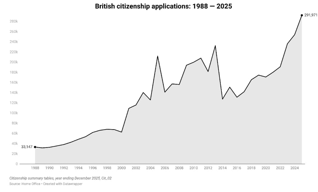 Applications for British citizenship have been rising since 2020. There were 291,971 applications for British citizenship in 2025, the highest on record. For some comparison, there were 170,692 applications for British citizenship in 2020.