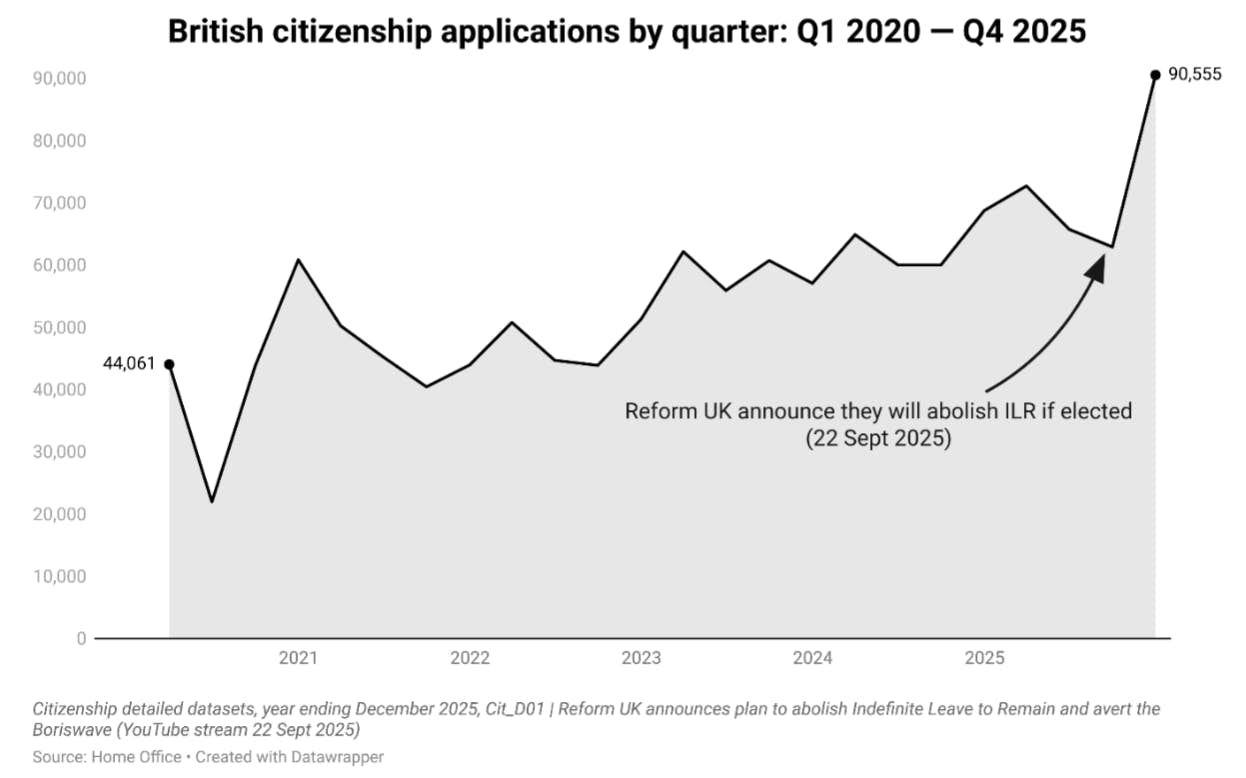 Below, I have plotted British citizenship applications by quarter, from Q1 2020 to Q4 2025. In Q3 2025, there were 62,928 applications, increasing to 90,555 applications in Q4 2025, an increase of 44 per cent.