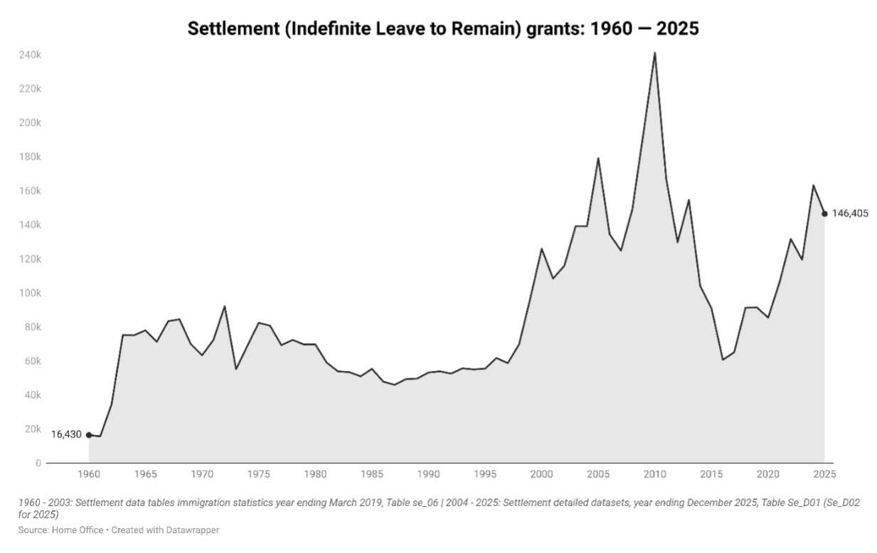 146,405 settlement (Indefinite Leave to Remain) grants were issued in 2025; this is a decrease from the 163,242 grants issued in 2024 and remains below the current all-time peak of 241,192 grants in 2010.