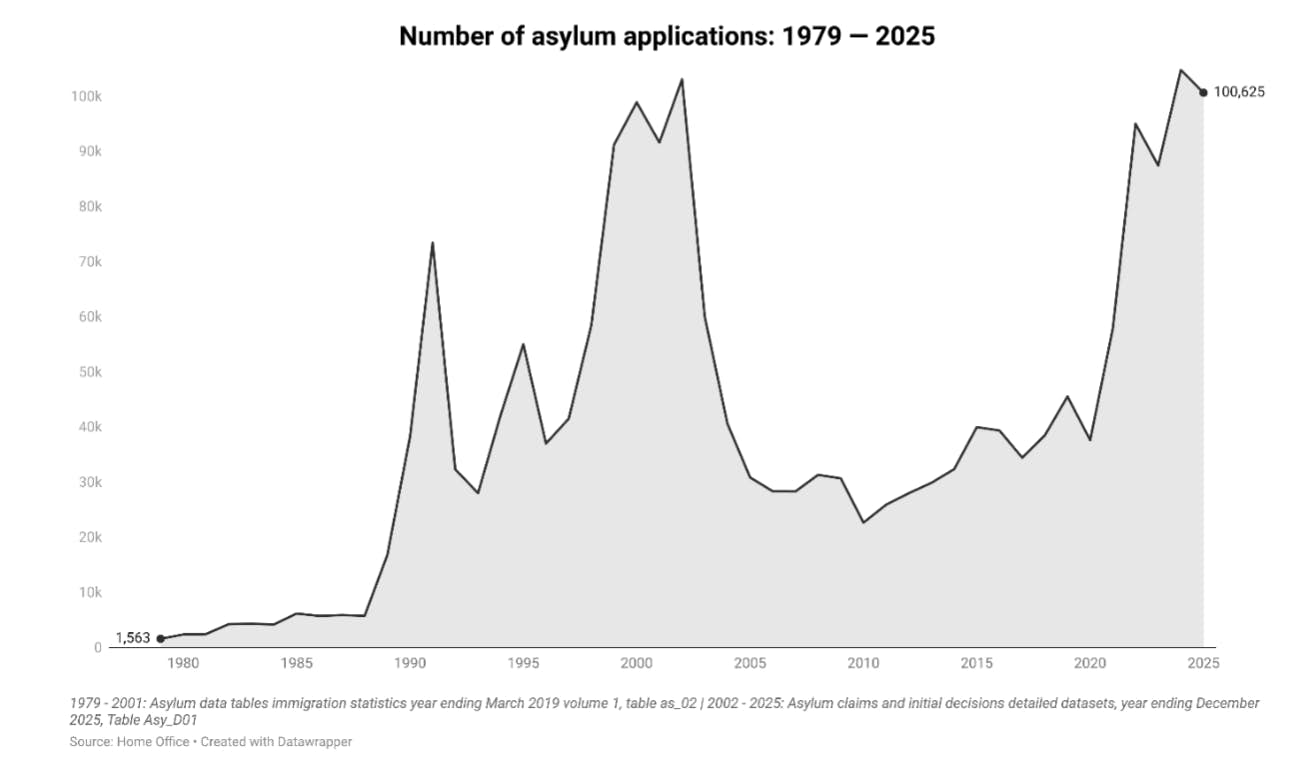 100,625 people claimed asylum in the UK in 2025, this is down from the peak of 104,764 in 2024, though remains well above recent levels. There were 45,537 asylum applications in 2019.
