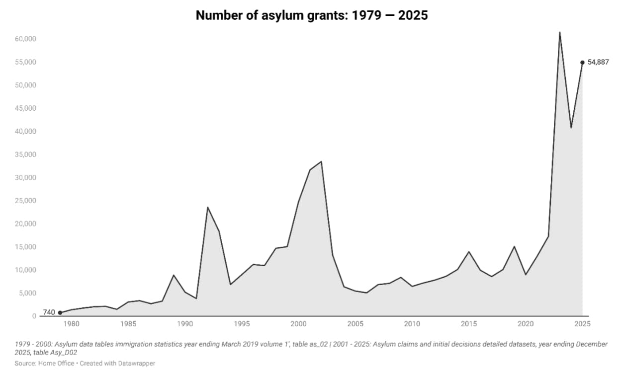 The number of asylum grants in 2025 stood at 54,887, this is below the peak in 2023, which stood at 61,478, though this is an increase over the number of asylum grants in 2024, which stood at 40,754.