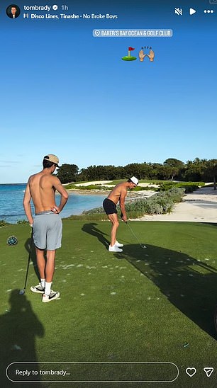 The NFL legend took to Instagram to share footage of the father-and-son duo teeing off at the luxury Bakers Bay Golf and Ocean Club in the Bahamas.