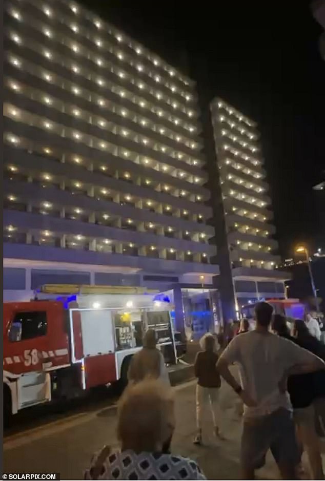 The evacuation order is said to have affected 490 guests including several Brits, pictured as they stood outside the hotel in the dark while firefighters entered and left the premises