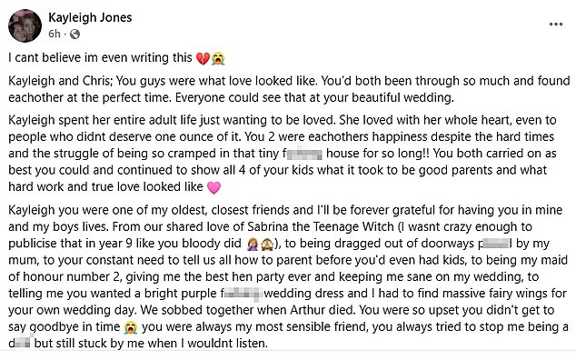 Friend Kayleigh Jones posted on her profile: ‘Kayleigh and Chris; You guys were what love looked like. You’d both been through so much and found each other at the perfect time. Everyone could see that at your beautiful wedding…