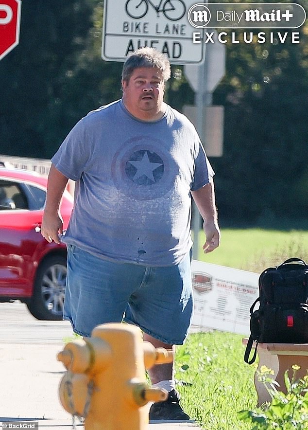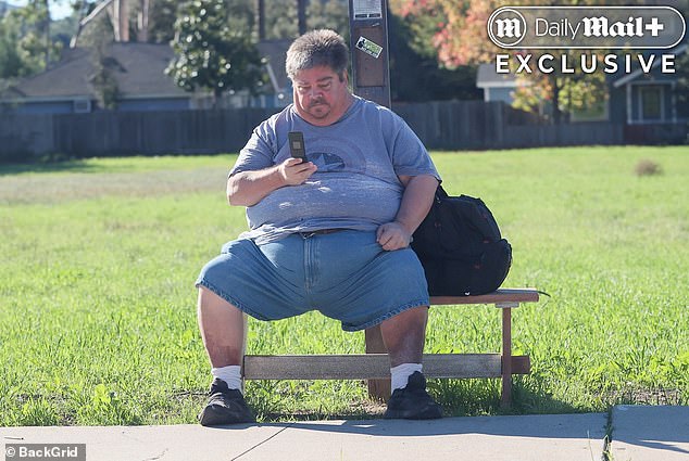 With alarming red blotches on his legs and weighing an estimated 350lbs, Jess cuts a forlorn figure as he scans his basic flip phone before hauling himself up for the arrival of a bus in Ojai, California.