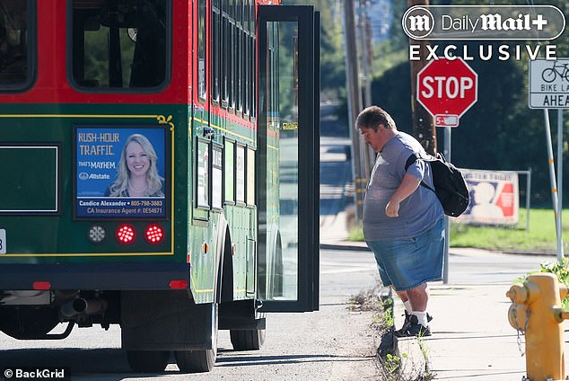 With alarming red blotches on his legs and weighing an estimated 350lbs, Jess cuts a forlorn figure as he scans his basic flip phone before hauling himself up for the arrival of a bus in Ojai, California
