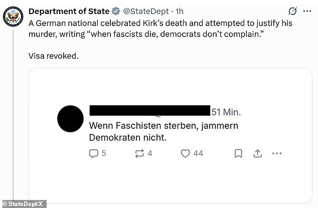 Among those targeted was an Argentine who said Kirk ‘devoted his entire life spreading racist, xenophobic, misogynistic rhetoric’ and deserves to burn in hell, as well as a South African who said those grieving Kirk were ‘hurt that the racist rally ended in attempted martyrdom.’