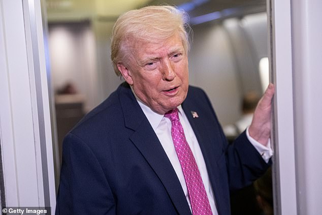 President Donald Trump speaks to reporters on board Air Force One Sunday night. Fresh polling from the Daily Mail and JL Partners shows Trump getting a 3 point bump, after he said the US was negotiating with Iran for a ceasefire deal