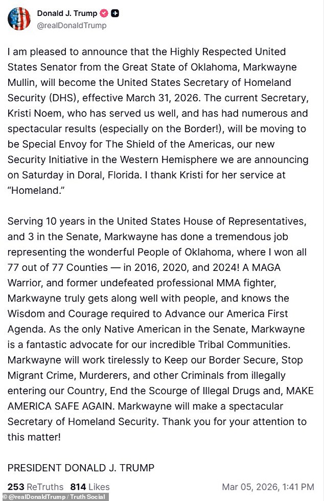 ‘I am pleased to announce that the Highly Respected United States Senator from the Great State of Oklahoma, Markwayne Mullin, will become the United States Secretary of Homeland Security (DHS), effective March 31, 2026,’ Trump posted on Truth Social.